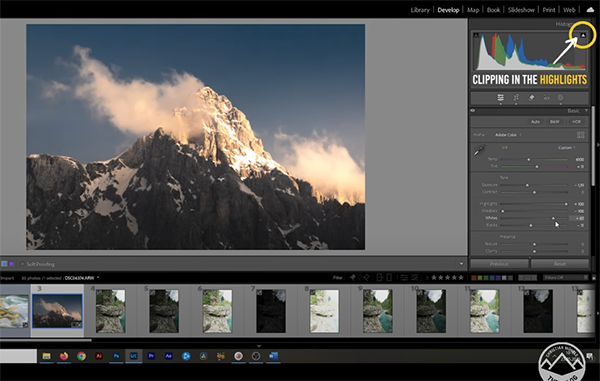 The next step is increasing the highlights to significantly distinguish between the brighter and darker tones in the image. He also pushes the whites, taking care to avoid clipping, and illustrates how Lightroom will let you know when you’ve taken the highlight and shadow adjustments too far.